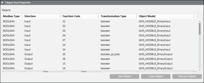 Object Model | For each Modbus type, you can select or edit a specific object model. |