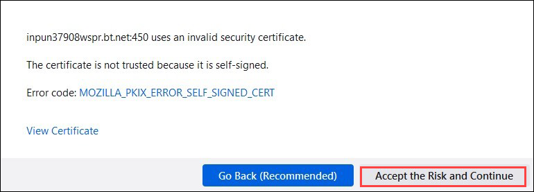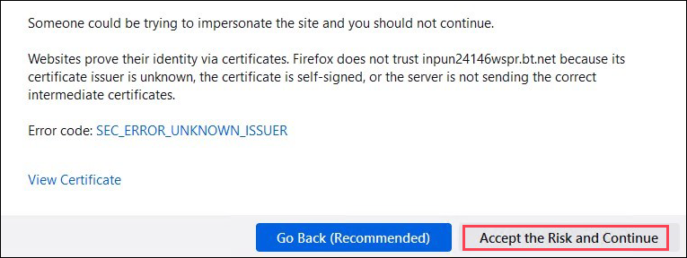 b. If you have used host certificate while creating a web application, in addition to dialog box Accept risk and Continue.
