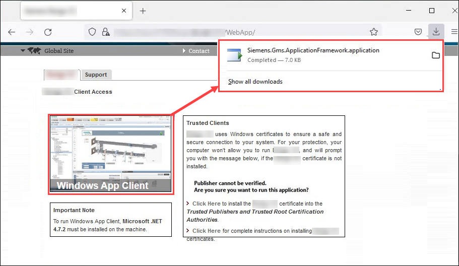Do this procedure to start Desigo CC as a Windows app client (the client software which is downloaded and installed on demand from a browser).