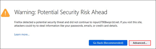 • For Firefox browser, a warning message displays. Click Advanced.