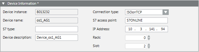 This expander displays the S7 device data settings. You can view the Device instance (S7 device numeric ID) and Device Name (name of the S7 device) and modify the following parameters: