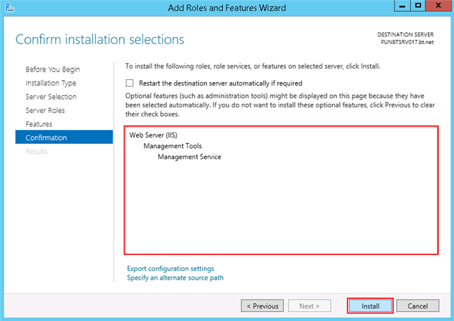 1. In the Server Selection > Server Roles, expand Web Server (IIS) and select Management Service under Management Tools.