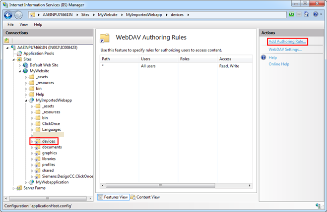 Select Sites > [website] > [web application] > [Virtual Directory] for which you want to enable the WebDAV Authoring Rules and double-click WebDAV Authoring Rules.