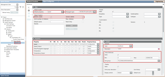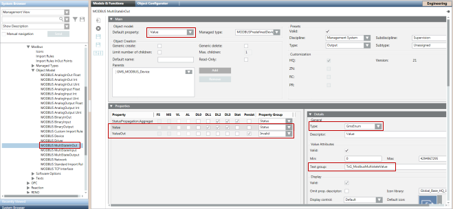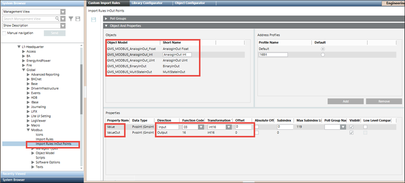 These object models and their Import Rules have been pre-configured so that they can be used directly without requiring any re-configuration. For example, the function codes of the Value and ValueOut properties have been set to support reading from and writing to that particular point. However, you can change the attributes (Function Code, Offset, Subindex and so on) of the properties in the custom Import Rules as per your requirements. For more information, see Objects and Properties Expander from the Custom Import Rules section.