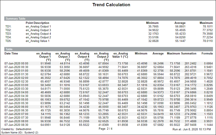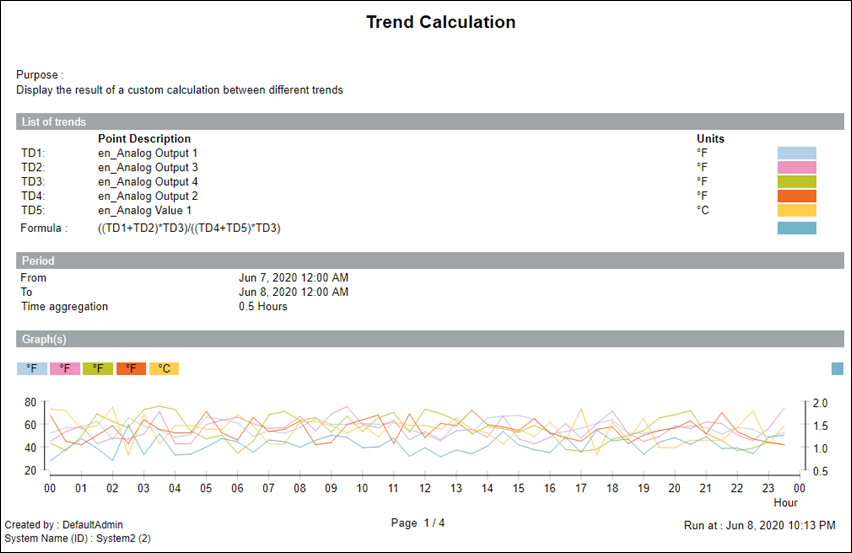This report is designed to display a chart or table or trend data for a maximum of 5 different trend log objects, and also displays result of a custom calculation between them. The report can be adjusted with different values to be specified in the Parameter dialog box, to allow the most frequent report content.