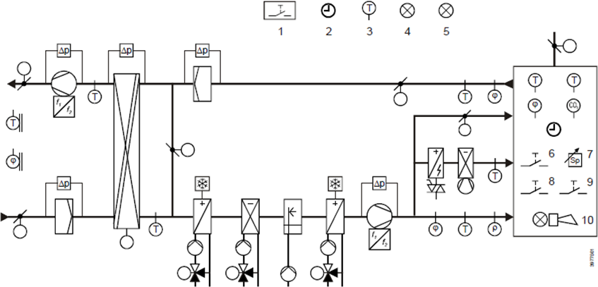 The document Climatix AHU BACnet Objects CB1Y3963en states that the Climatix application AHU includes all the common functionalities to control and monitor air conditioning units. The following schemas give an overview of selectable measured values and control equipment, as provided by the Climatix R&D unit and as provided by the Desigo CC graphic template.