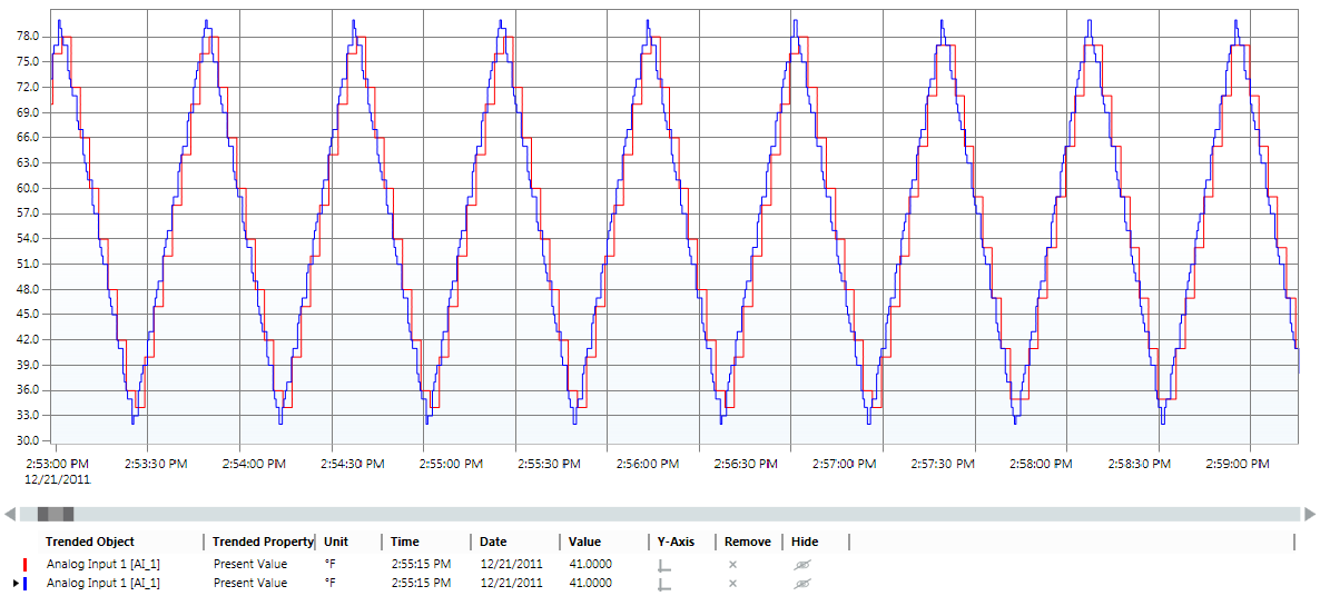 The trend view displays as follows. The red curve indicates that the offline trend data is not yet updated. The blue curve indicates the online trend data.