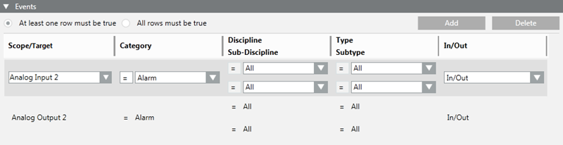 • In some cases, a radio button lets you specify whether all the conditions (AND logic between rows) or only one (OR logic between rows) must be true to assert the Events trigger/filter. If this radio button is absent, there is always an OR logic between the rows (at least one row must be true to assert the trigger/filter)
