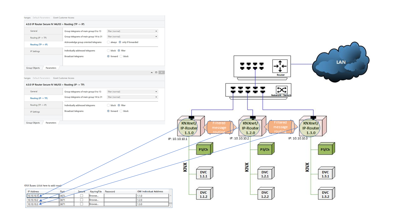 Message forwarding must be set suitably in order to avoid traffic overload and a collapse of the KNX line and KNX adapter due to message increase.