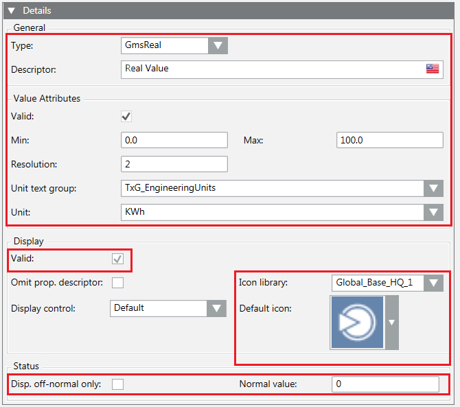 Object containing the valid range values and the resolution. For details, see Table GmsReal Properties, below. If the object is empty (“Properties”: { }), the values are reset: the range is double.MinValue ÷ double.MaxValue, while the resolution is 0.