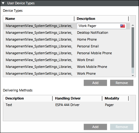 - The user device type is automatically configured. In the Recipient Editor tab, under the User Device Types expander, you can see that the ESPA 444 Driver is set as the handling driver and modality is set as Pager.