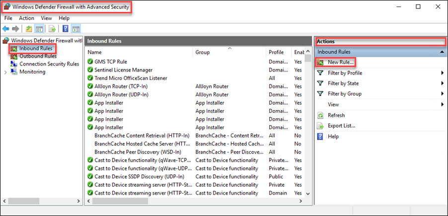 1. In the Windows Defender Firewall with Advanced Security dialog box, click Inbound Rules.