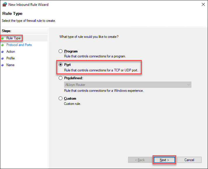 1. From Rule Type, select Port, and then click Next.