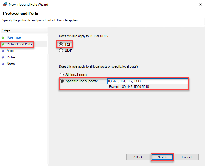 1. In the Specific local ports field, type all the TCP ports required for the server, and then click Next.