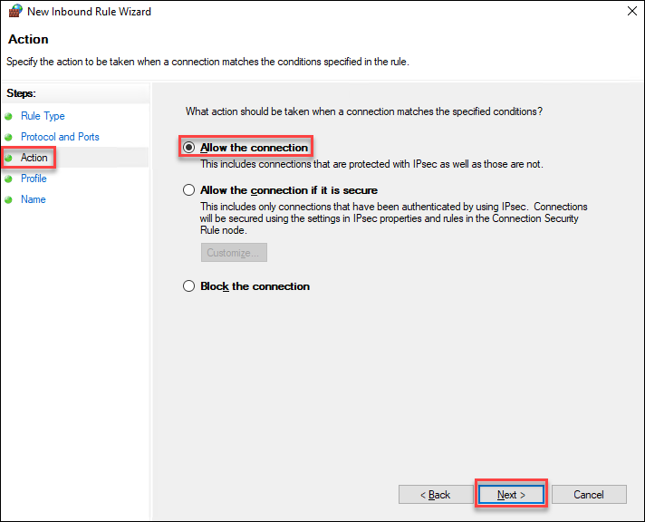 1. From Action, select Allow the connection, and then click Next.