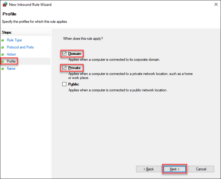 1. From Profile, select Domain and Private, and then click Next.