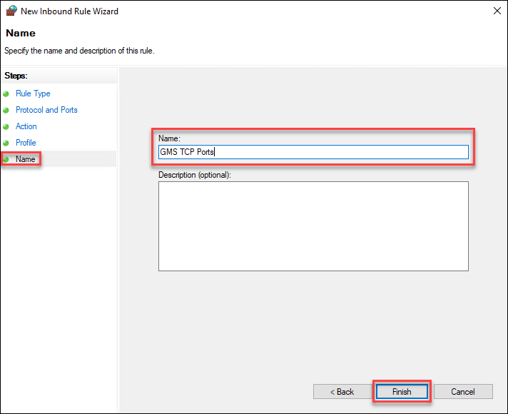 1. In the Name field, type the name for this rule. (For example, GMS TCP Ports.)