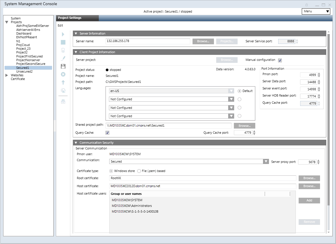 - The server name, service port, port numbers are changed, language are edited, the process monitor user is changed internally and synched with the current system account user for the selected project. The Shared project path is configured.