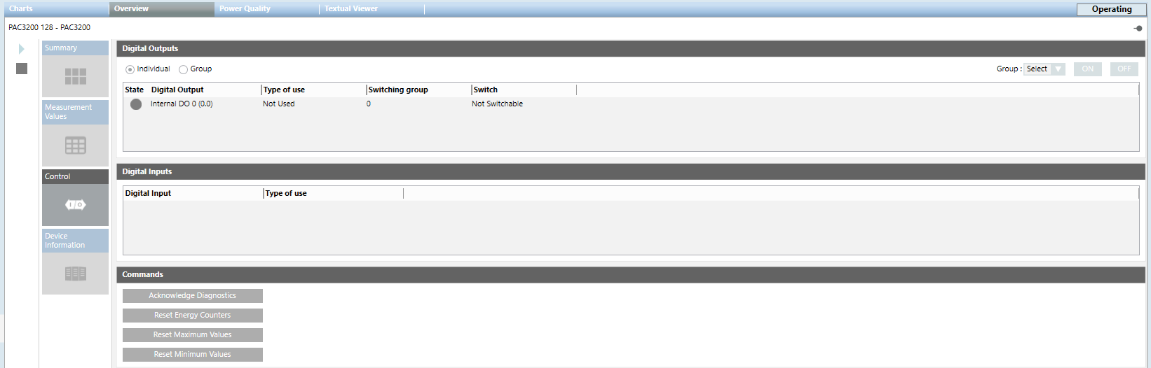 - Reset Energy Counters: Resets the values for the measurement points to 0.