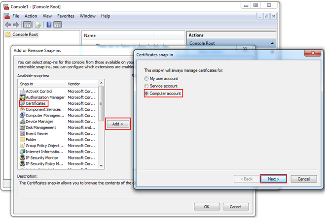 1. Do the following to add the Certificates in the Add or Remove Snap-ins dialog box: