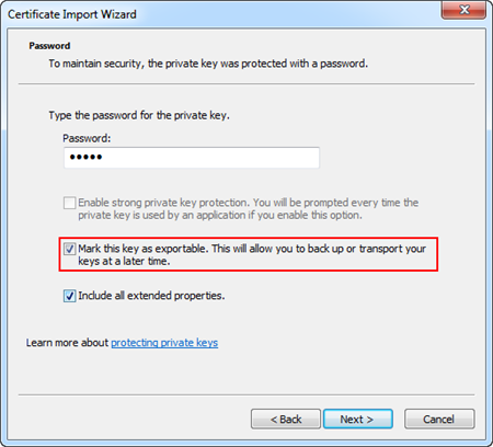 1. Select the Mark key as exportable check box for self-signed certificate pfx file import. This allows you to back up or transport your keys at a later time.