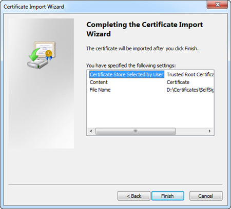 • The selected certificate (root or self-signed) is imported successfully to the selected store.