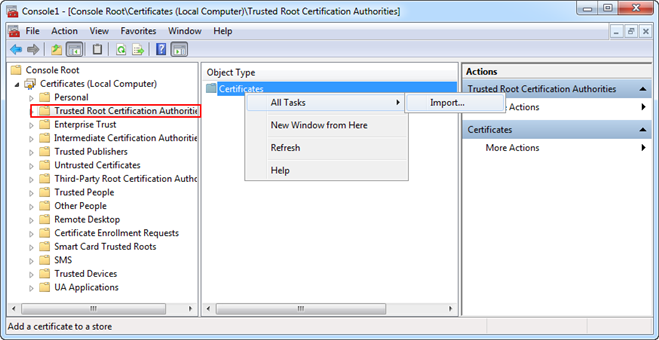 Import the Certificates in the Windows Store using MMC