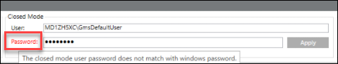 1. In the Password field of the Closed Mode section of the Settings expander, type the most recent password for the Closed mode user (GmsDefaultUser) that is set in Windows.