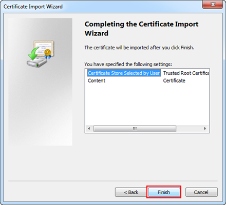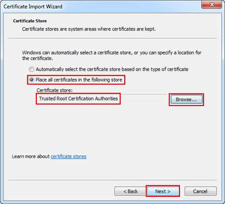 Select the Place all certificates in the following store option, and browse to and select Trusted Root Certification Authorities certificate store. NOTE: When installing certificates on the Windows 10 operating system, you must select the Windows store from where you want to import the certificate. For example, User Store.