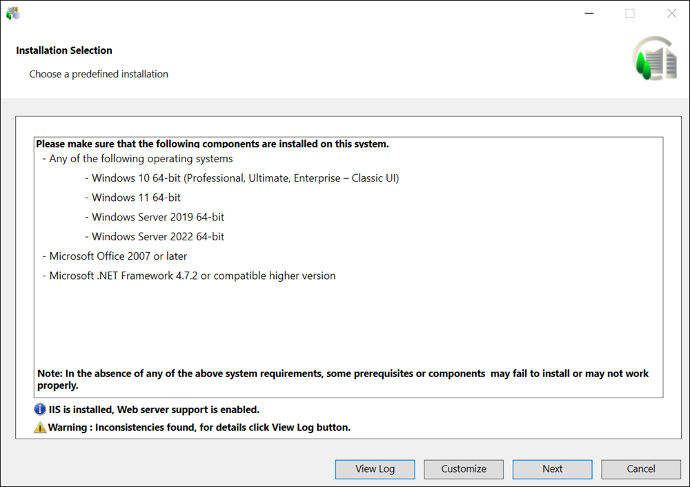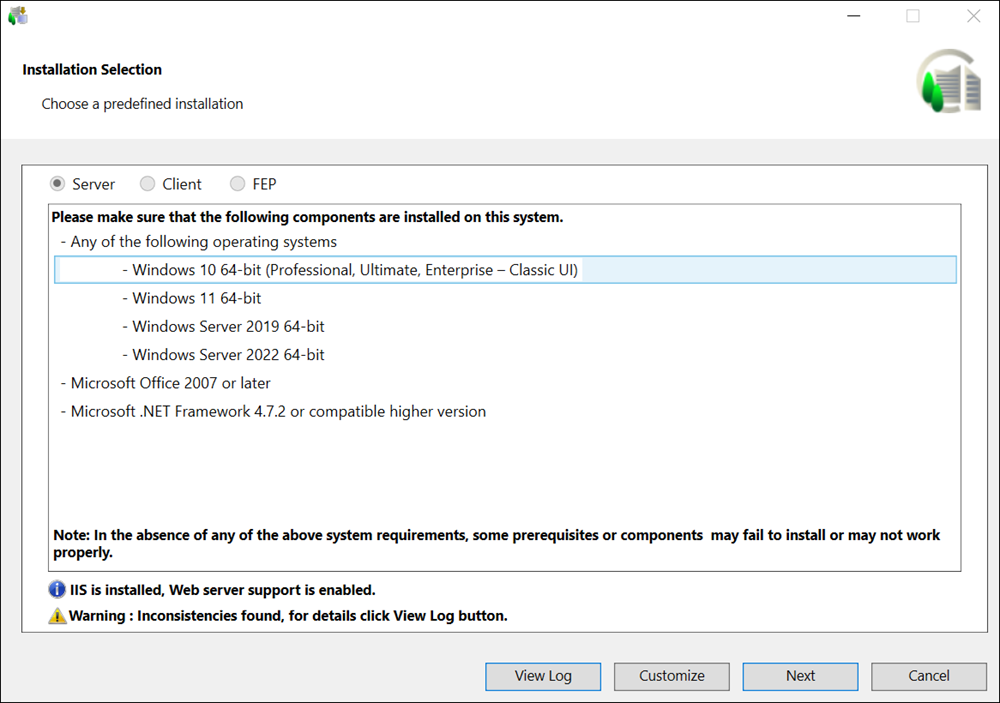 (Optional and required only when you want to install and configure IIS on the selected setup type) Verify that the checkbox for IIS configuration is selected by default. Alternatively, deselect it to skip IIS installation. The checkbox displays only when no IIS component is installed. Thus, the configuration of IIS settings are automated during installation only when no IIS settings are configured already. However, if any IIS component is already installed, a warning message displays informing you to manually configure IIS. (see manually install and configure IIS on the Server/Client/FEP computer). Installer does not automatically identify and complete the missing IIS components during installation. If all required IIS components are already correctly installed and configured, an info message displays and you can proceed with installation. NOTE: In case when no IIS components are configured but ARR is installed and enabled, installer displays a warning message and once the installation along with IIS configuration is completed you need to uninstall existing ARR and re-install ARR and enable it. For more information, see Install Application Request Routing (ARR) in Manually Install and Configure IIS on Different OS Types.