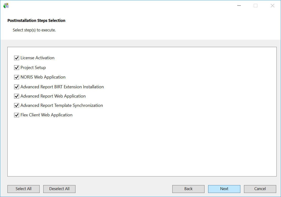 Since the GMS Platform.xml file includes the required post-installation steps for GMS/extension, the PostInstallation Steps Selection dialog box does not display. However, if there is any inconsistency, for example, the configured post-installation step is not available in the [GMS/EM Name]PostInstallationConfig.xml, then the PostInstallation Steps Selection dialog box displays, assisting you in selecting the GMS/EM post-installation steps. For more information see, Consistency Check Scenarios. NOTE: Only those post-installation steps are displayed in PostInstallation Steps Selection dialog box for which the value for the tag Execute = AskUser is configured in the [GMS/EM Name]PostInstallationConfig.xml file. If Execute = Always is configured in the [GMS/EM Name]PostInstallationConfig.xml file, that post-installation step is not listed in the PostInstallation Steps Selection dialog box. In this case, the post-installation steps are directly listed in pending list of the Ready to Install the Program dialog box. During installation of the Platform or extension, the Post Installation folder is copied to ..\GMSMainProject and the post installation steps are executed from ..\GMSMainProject\PostInstallation\GMS or ..\GMSMainProject\PostInstallation\EM\[EM Name].