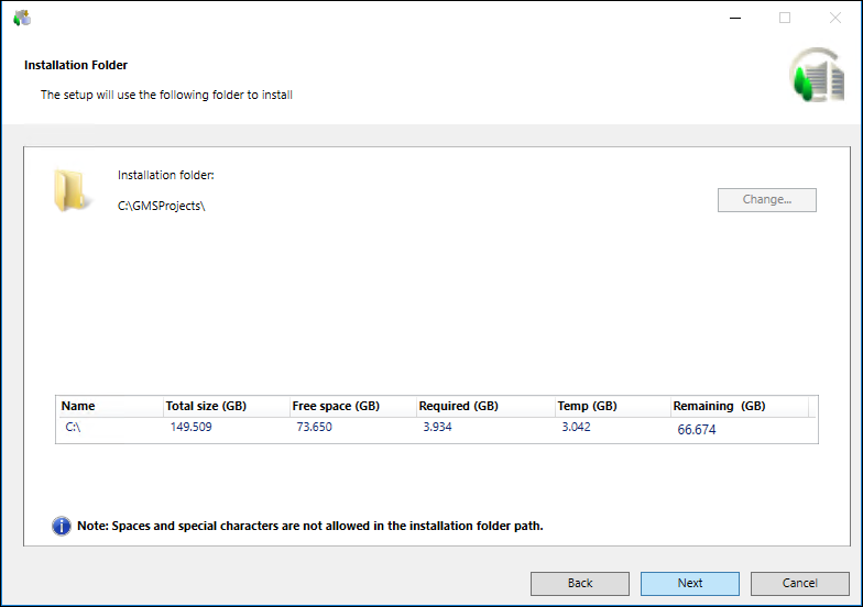NOTE: The Installer calculates and displays the disk space required on the selected drive and the temporary disk space required only for the time of installation (always calculated only for the system drive). For more information, see Installation Folder in Verify the Installation Environment.