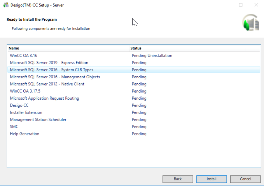 The Ready to Install the Program dialog box that displays listing the status of the prerequisites, Desigo CC installation (platform + mandatory extensions), platform patch, non-mandatory extensions, mandatory extension patches, non-mandatory extension patches, help merging status, and the status of the post-installation steps selected for execution during the upgrade process.