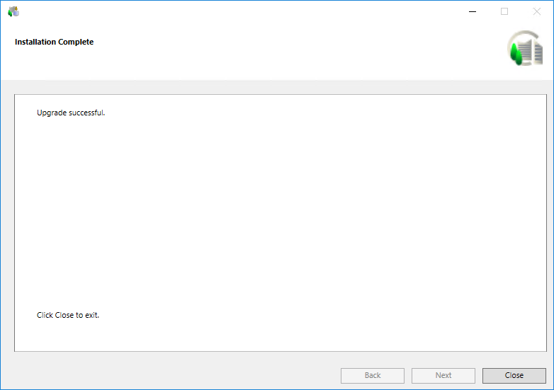 - When the installation program is complete, the Upgrade Complete dialog box displays. Click Close to complete the upgrade.