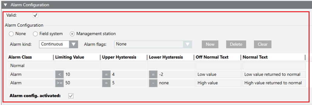 AlarmProperty | Optional | Specifies the operand and the value of the alarm condition (Value Range). In case of normal condition, this data is ignored and can be omitted. In all the other alarm conditions it is necessary to specify it. For details about the configuration, see Continuous Alarms – AlarmProperty, below. |