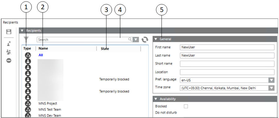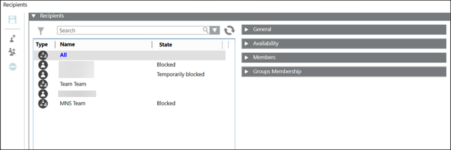 Displays the list of recipients belonging to the group with the user type, name, and the user status information.