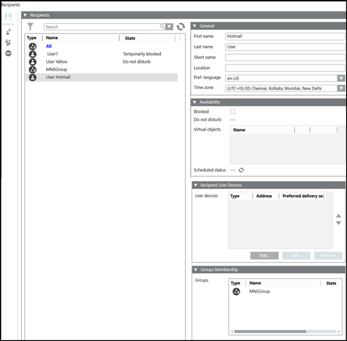 Displays the list of user devices for the selected recipient user. Each user device configuration consists of device type, address, and the preferred delivery method.