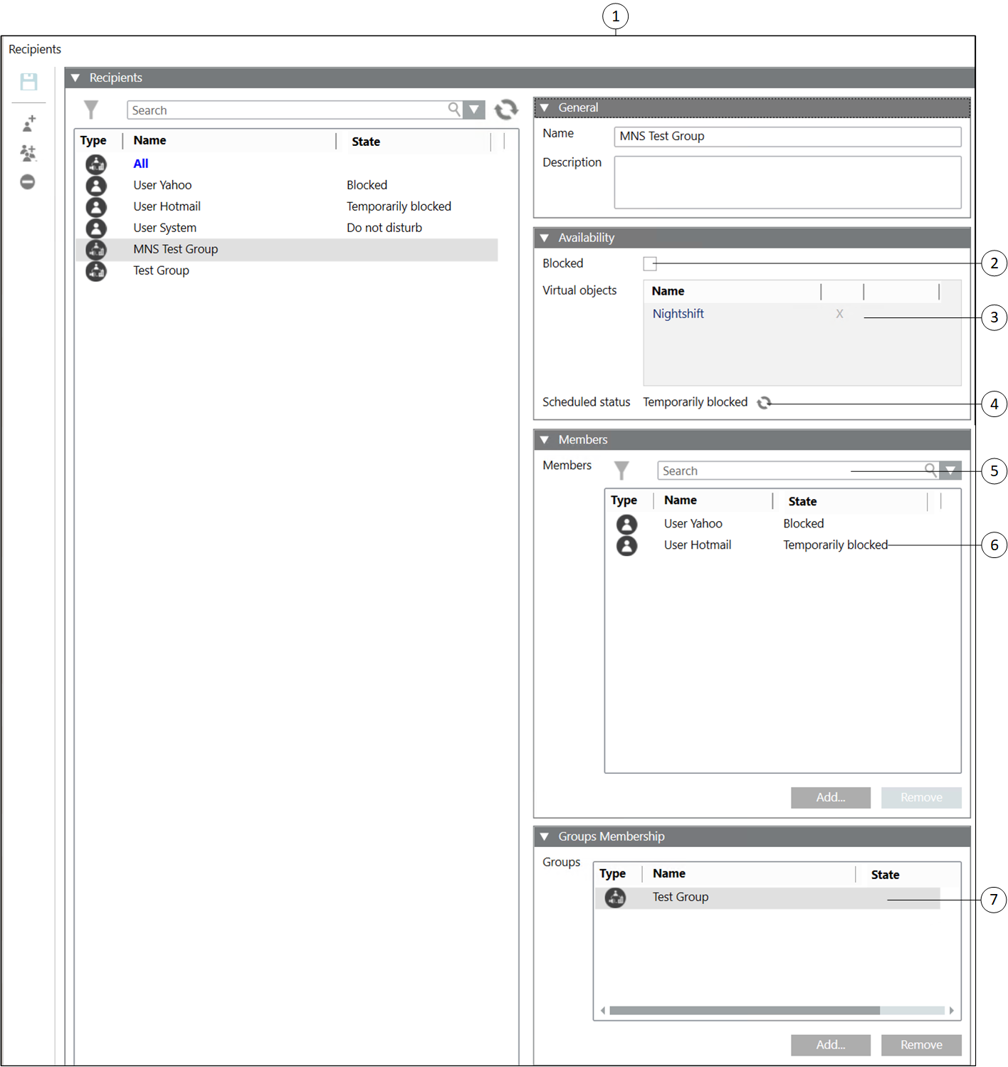 The recipient group details are displayed if a recipient group is selected from the recipients list: