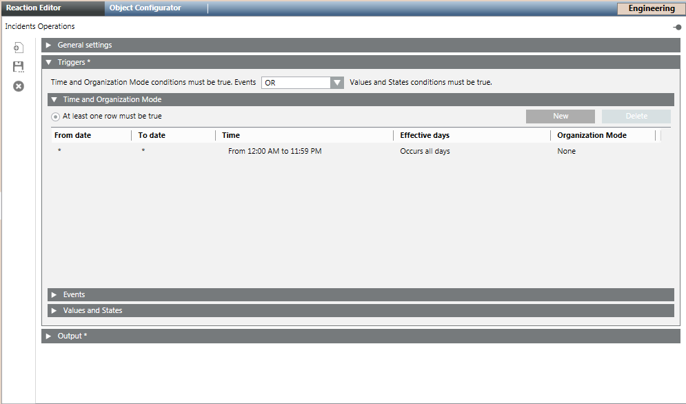 1. Open the Triggers expander and specify if the conditions specified in both, Events as well as Values and States, expanders must be true or if the conditions specified in either of the expanders must be true by selecting the appropriate operator (AND, OR) in the drop-down list.
