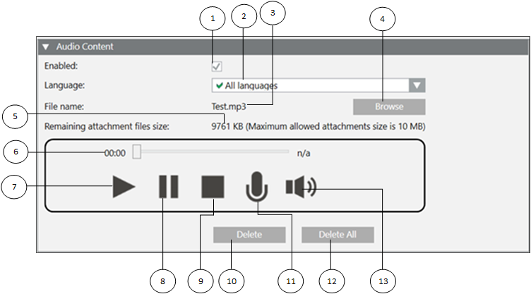 10 | Delete | Delete the uploaded audio file or the recorded audio content. |