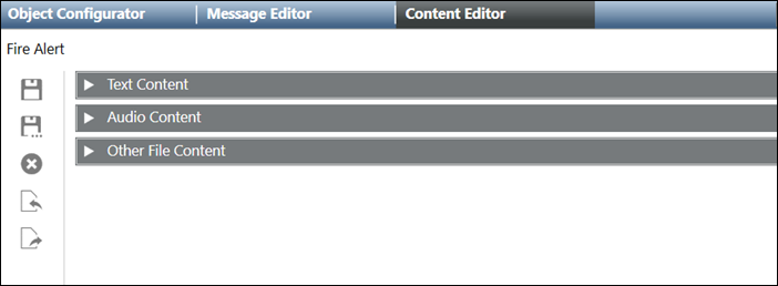 The Content Editor tab allows to add and configure the message content in the form of text, audio or other files (for example, video, pdf or text file).