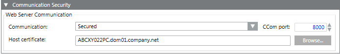The Web Server Communication group in the Communication Security expander allows you to configure secure web communication between Server project and IIS (typically remote web server) that takes place over the CCom port. The communication is secured using host certificate.