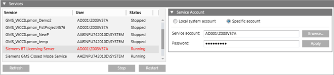 • From the Services expander, you can change the Service account user of a listed service except the project's Pmon service, GMS_WCCILpmon_[Project Name]. When needed, the Pmon service GMS_WCCILpmon_[Project Name], Service account user can be changed using System Accounts of the Settings expander.