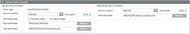 The Web Server Communication group in the Communication Security expander allows you to configure secure web communication between Server project and IIS (typically remote web server) that takes place over the CCom port. The communication is secured using host certificate.