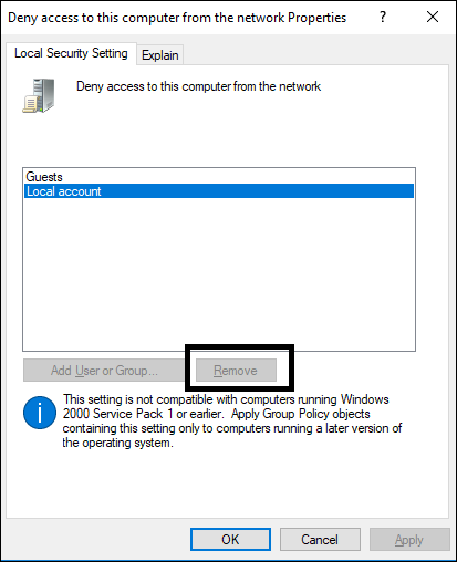 1. Verify your local policy for Deny access to this computer from the network.