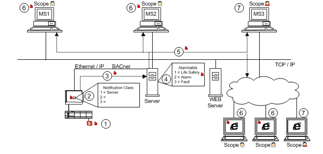 The field system alarm configurator connects the alarm event notification (from the automation station) to the associated alarm class such as Life Safety, Fault, Alarm, and so on.