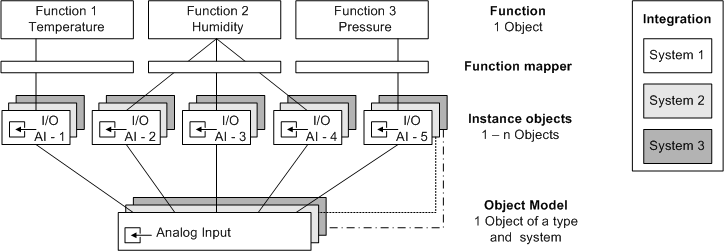 Instantiated objects for individual subsystems are always related to an Object Model and a Function. This concept ensures that the user experiences the same operating and monitoring philosophy for the same or similar Functions.