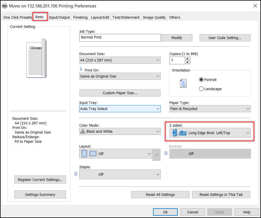 1. In Basic settings, select Long Edge Bind printing option from 2-sided drop-down list and click OK.