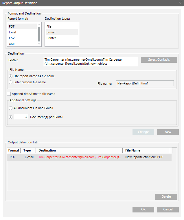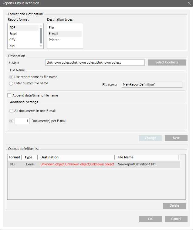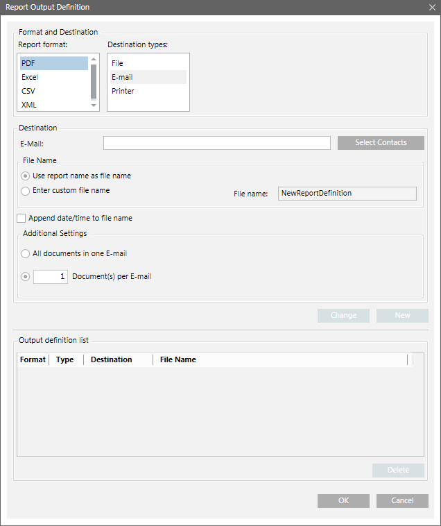 The Report Output Definition dialog box allows you to send a report via email. You can send all documents in one mail or configure the number of documents to be sent per email. The default is one document per email. Before sending an email you must configure the mail server.