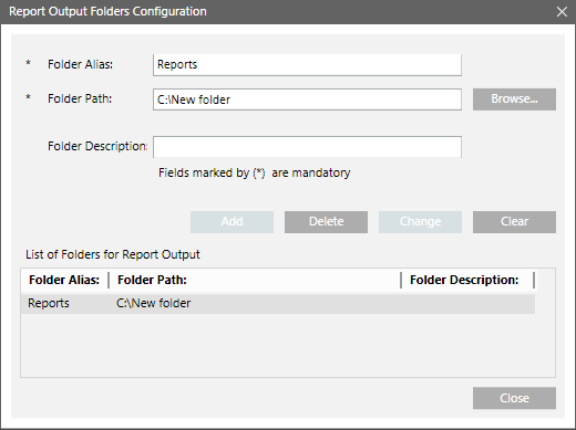 Adds the Folder Alias, Folder Path, and Folder Description in the List of folders for Report Output. This button is unavailable until all the mandatory fields are filled.
